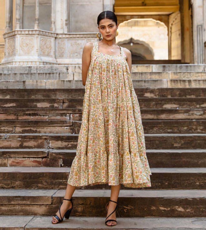 Green Ilahi Margarita Printed Cotton Tiered Midi Dress