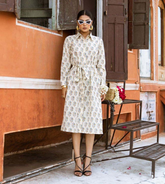 White Ilahi Mamacita Printed Cotton Midi Shirt Dress