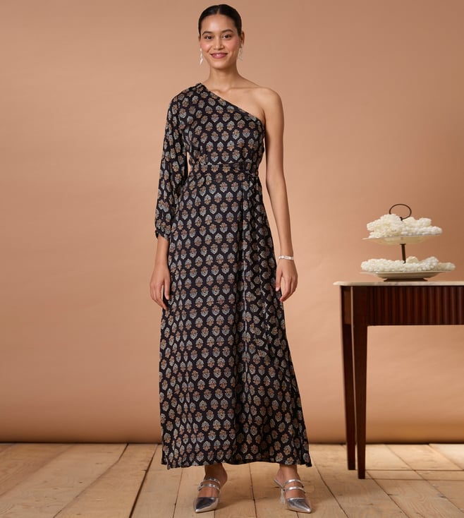 Black Garnet Gypsy Handblock Printed Chanderi Silk Ajrakh One-Shoulder Dress