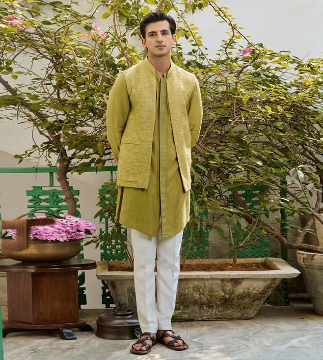 Light Green Embroidered Cotton Silk Slim Fit Bandi