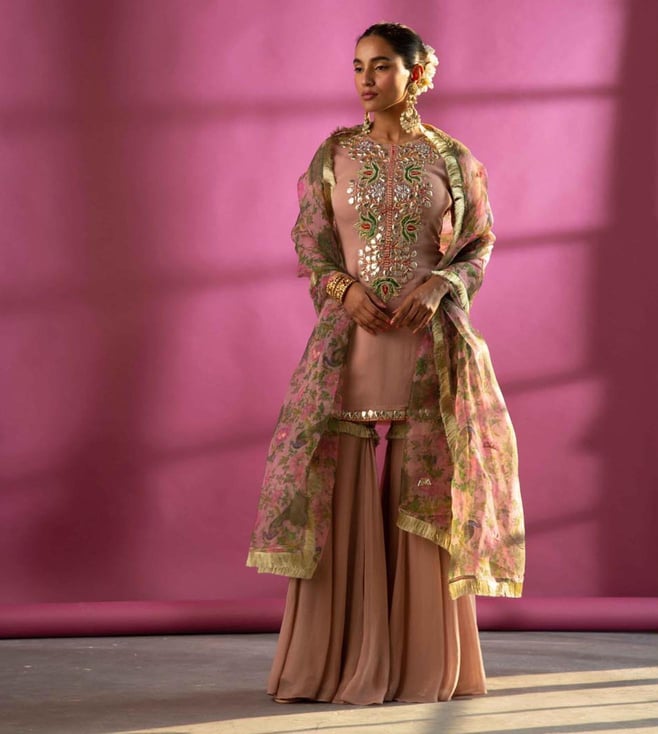 Dark Rose Gold Gota Patti Short Shirt with Garara and Dgital Print Dupatta
