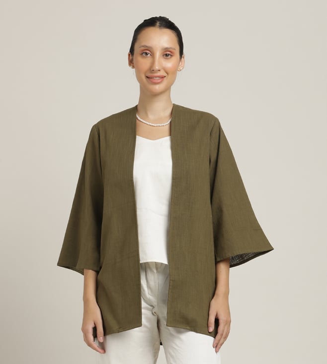 Women Solid Linen Navy Blue Single Breasted Shawl Collar Long Shrug
