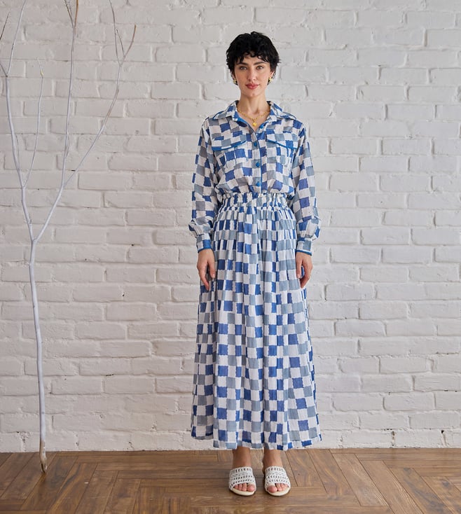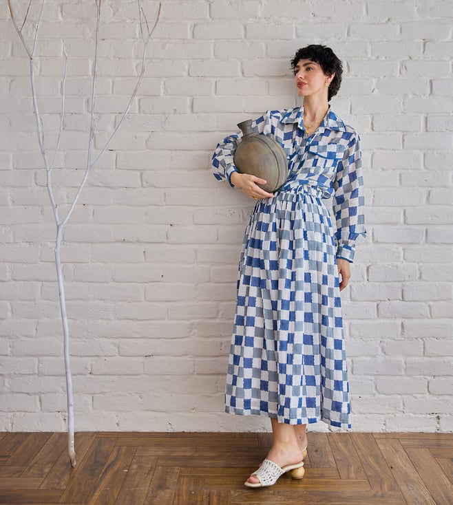 Blue & White Cotton Mulmul Block Printed Checks Dress