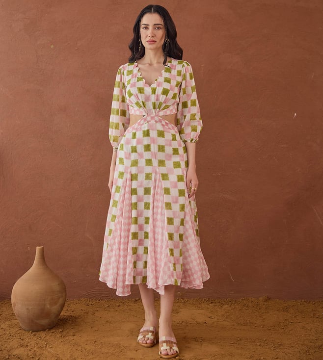 Multicolour Cotton Mulmul Block Printed Checks Dress