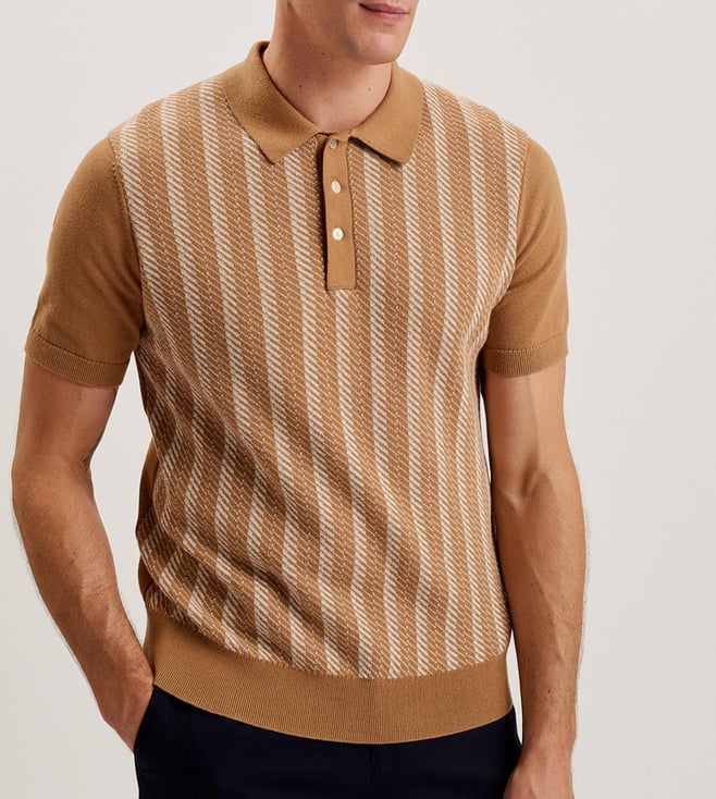 Brown Striped Knitted Short Sleeves Polo T-Shirt