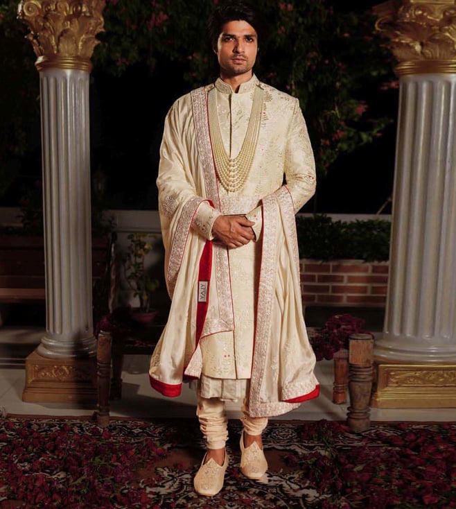 Ivory Ramgatha Kusha Sherwani Set With Kurta And Churidaar And Dupatta