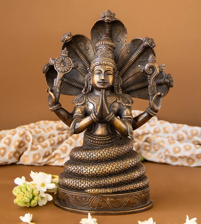 Panchmuki Nag Vishnu Brass Big Idol - Gold And Brown Finish