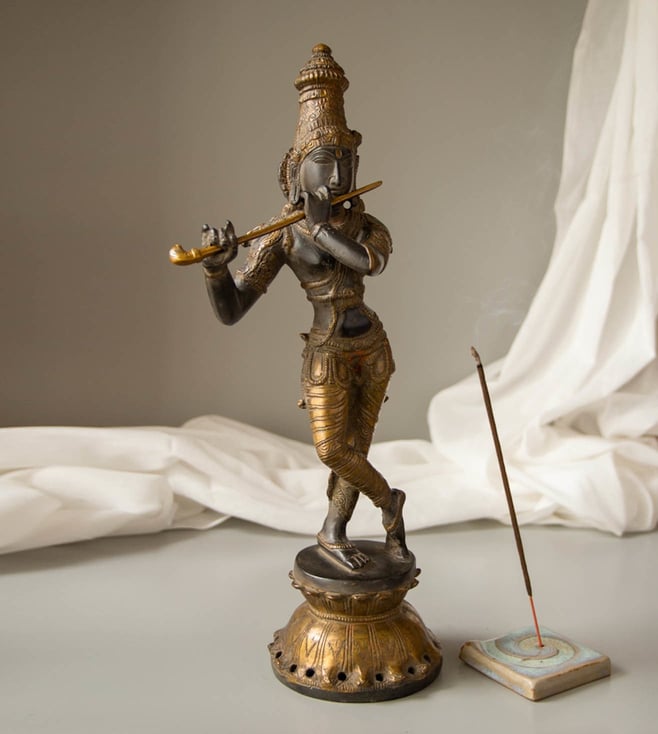 Lord Krishna Playing The Flute Brass Big Idol - Gold & Black Patina Finish