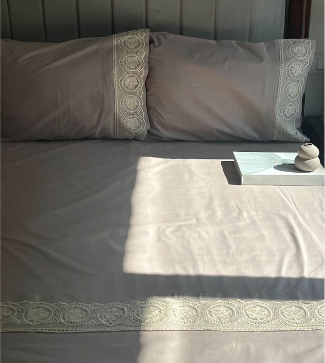 Elephant Grey Cotton Lace 250 TC Super king Bedsheet with Pillow Cover