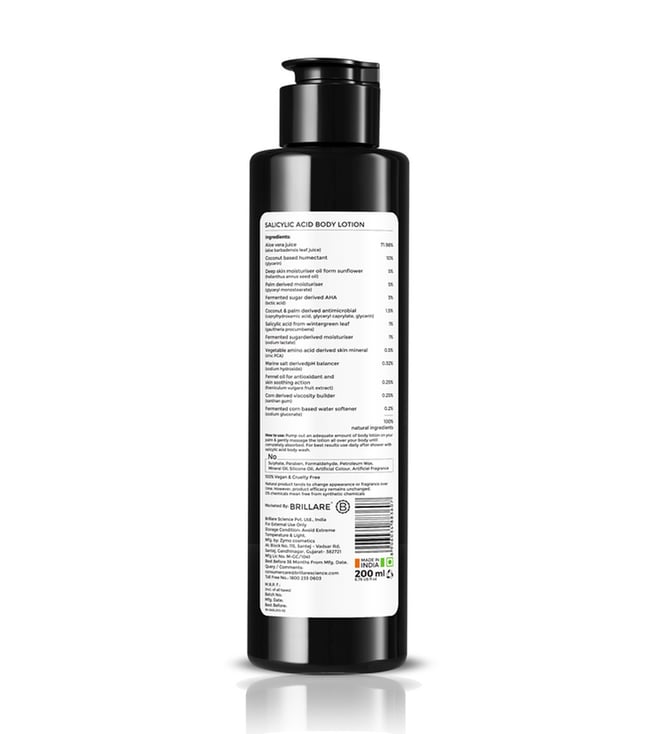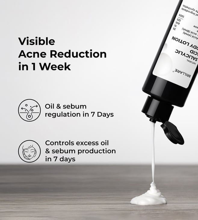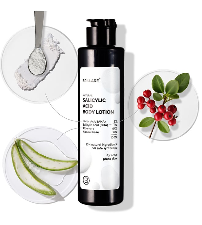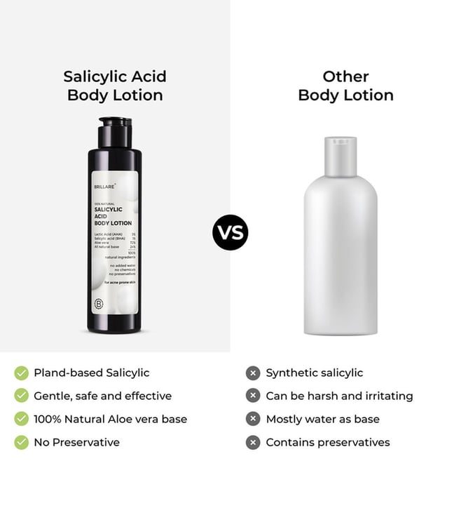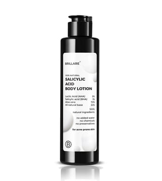Brillare 100% Natural Salicylic Acid Body Lotion made from salicylic acid and zinc for acne prone skin. Our Brillare 100% Natural Salicylic Acid Body Lotion is a daily exfoliating lotion enriched with salicylic acid and lactic acid that exfoliates the dead cells from skin while providing hydration to skin by increasing cell turnover. Also reduces body acne and dark spots revealing smooth, hydrated even skin tone.