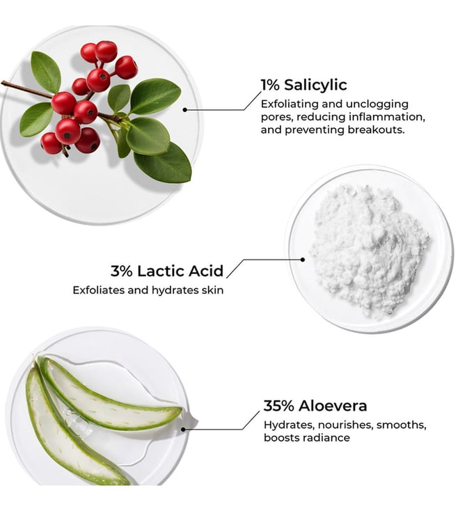Aloe Vera Juice, 71.98% (Aloe Barbadensis Leaf Juice) Coconut Based Humectant, 10% (Glycerin) Deep Skin Moisturiser Oil Form Sunflower, 5% (Helianthus Annus Seed Oil) Palm Derived Moisturiser, 5% (Glyceryl Monostearate) Fermented Sugar, Derived Aha 3% (Lactic Acid) Coconut & Palm Derived Antimicrobial (Caprylhydroxamic Acid, Glyceryl Caprylate, Glycerin), 1.5% Salicylic Acid From, Wintergreen Leaf (Gaultheria Procumbens), 1% Fermented Sugar Derived Moisturiser, 1% (Sodium Lactate) Vegetable Amino Acid Derived Skin Mineral, 0.5% (Zinc Pca) Marine Salt Derived Ph Balancer, 0.32% (Sodium Hydroxide) Fennel Oil For Antioxidant And Skin Soothing Action, (Foeniculum Vulgare Fruit Extract), 0.25% Corn Derived Viscosity Builder, 0.25% (Xanthan Gum) Fermented Corn, Based Water Softener, 0.2% (Sodium Gluconate).