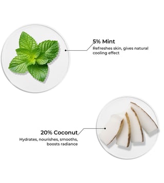 Aloe vera juice 49.8499% (aloe barbadensis leaf juice), Coconut water 20% (cocos nucifera water), Coconut based humectant 7% (glycerin), Fractionated coconut oil 5% (caprylic/capric triglyceride), Peppermint water 5% (mentha piperita leaf water), Skin conditioning agent 3% (dimethicone), Sunflower oil 2% (helianthus annus seed oil), Coconut based thickener 2% (cetostearyl alcohol), Denatured alcohol derived from plant grain 2% (ethyl alcohol), Coconut derived emulsifier 1.5% (glyceryl stearate citrate), Perfume 1.2%, Preservative 1% (ethylhexylglycerin, phenoxyethanol), Fermented corn based water softener 0.2% (sodium gluconate), Viscosity modifier 0.15% (xanthan gum), Peppermint oil 0.1% (mentha piperita leaf oil), Colour 0.0001% (CI 19140, CI 42090)