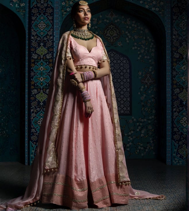 Soft Pink & Gold Aachal Hand Embroidered Panelled Banarasi Silk Lehenga with Blouse