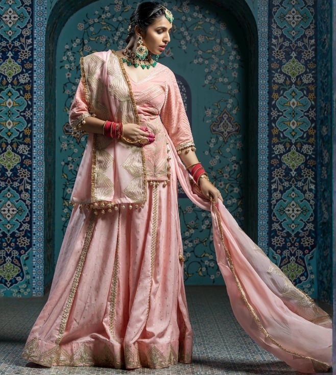 Salmon Pink Shehzaadi Gulbadan Lehenga set Tunic And Dupatta