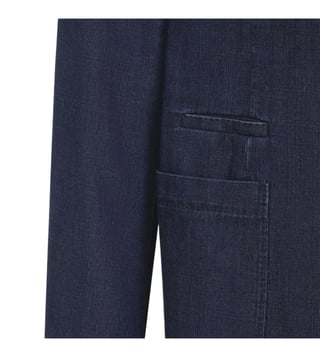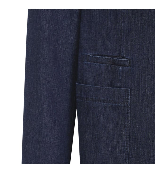 Blue, cotton denim, three button fastening, patch pockets, notched lapels.