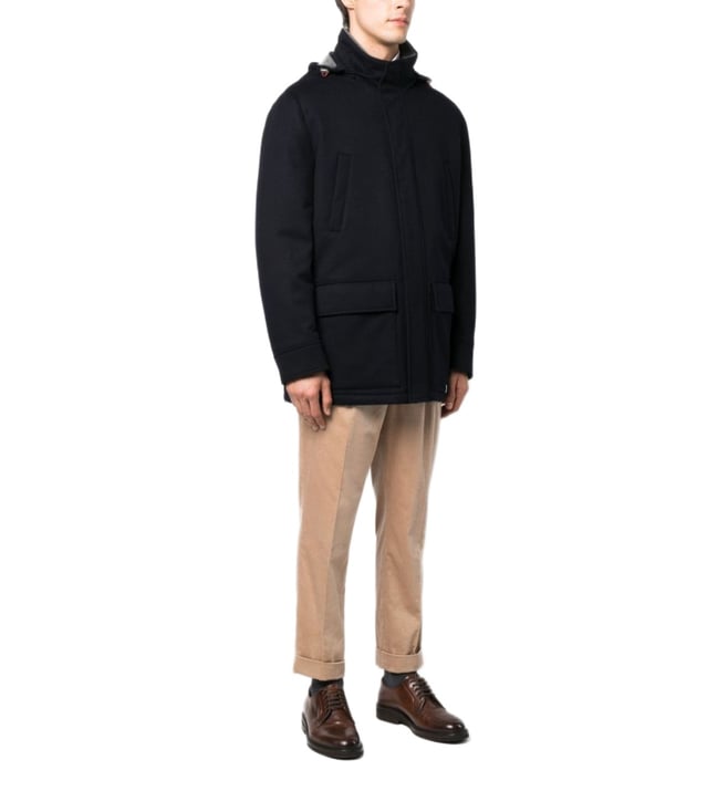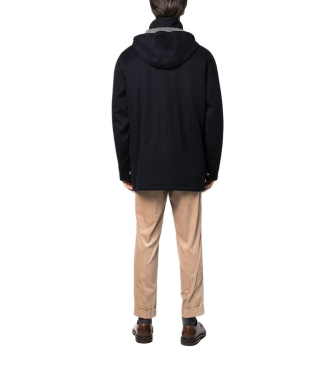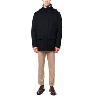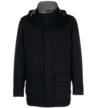 Elevate your style with the Brunello Cucinelli Black Regular Fit Parka Jacket. Detachable hood coat from brunello cucinelli featuring midnight blue, silk cotton blend, standup collar, detachable drawstring hood, concealed front fastening, long sleeves, belted cuffs, two side slit pockets, two side flap pockets and lining: cotton, polyester, nylon this piece fits true to size. recommend you get your regular size model is 1,84m / 6ft 1in wearing size 48 (it).