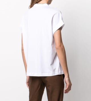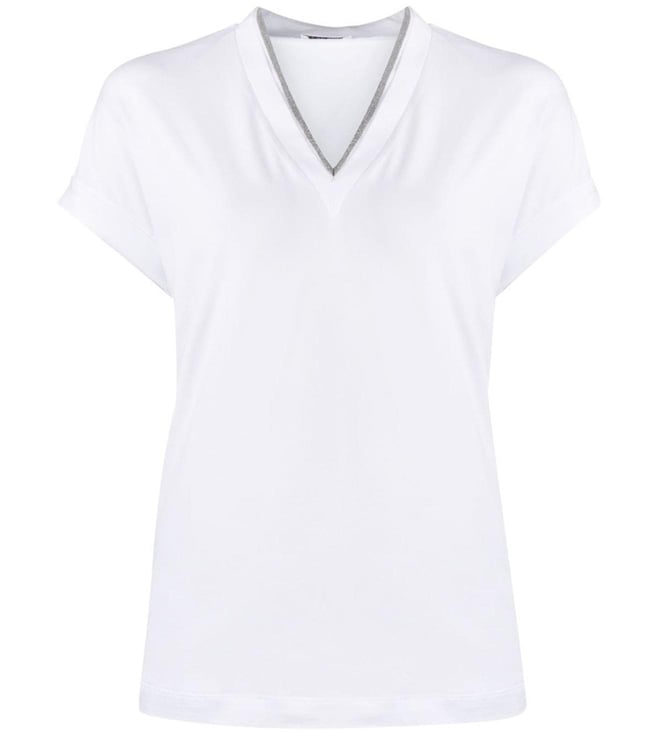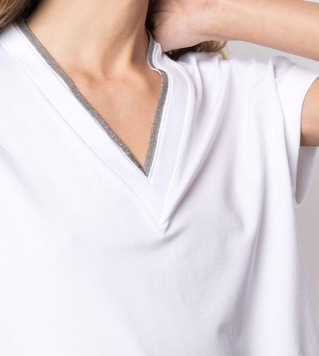 Elevate your wardrobe with the Brunello Cucinelli White V-Neck Cotton T-Shirt, a masterpiece of understated elegance. Crafted for women, this regular fit tee combines 93% premium cotton with 7% spandex for a soft, flexible feel. Its pristine white hue and classic V-neck design offer timeless versatility, while the subtle pattern adds a touch of sophistication. Perfect for any occasion, this t-shirt embodies luxury and comfort, making it a must-have staple in your collection.