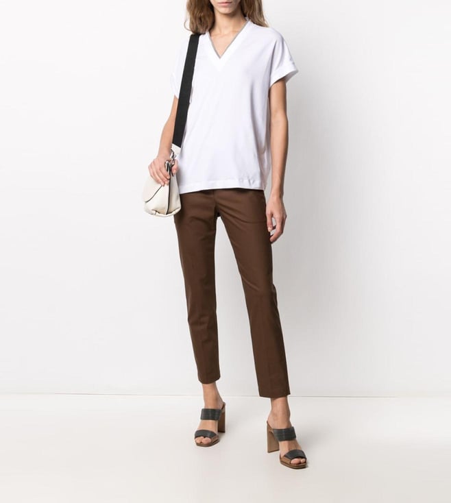 Elevate your wardrobe with the Brunello Cucinelli White V-Neck Cotton T-Shirt, a masterpiece of understated elegance. Crafted for women, this regular fit tee combines 93% premium cotton with 7% spandex for a soft, flexible feel. Its pristine white hue and classic V-neck design offer timeless versatility, while the subtle pattern adds a touch of sophistication. Perfect for any occasion, this t-shirt embodies luxury and comfort, making it a must-have staple in your collection.