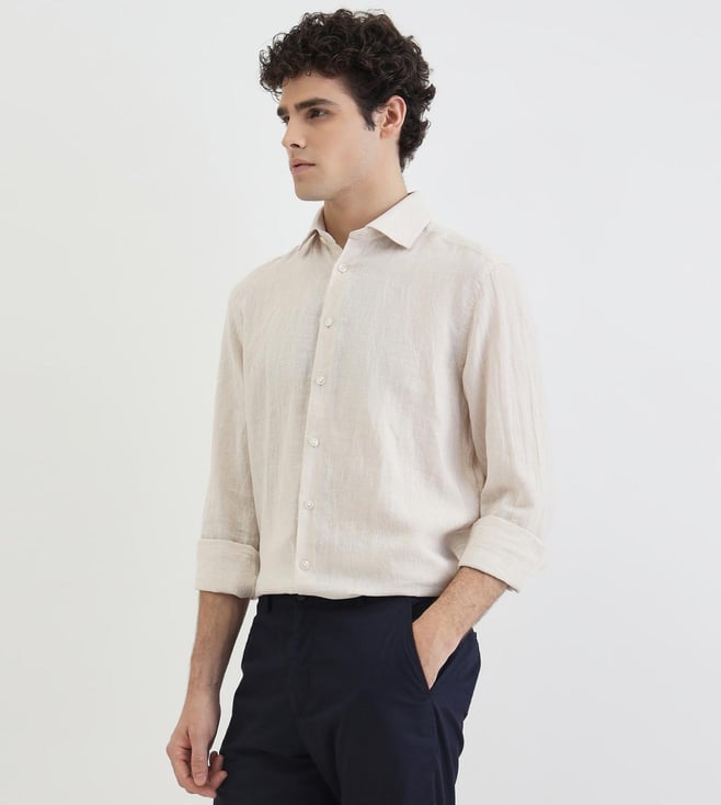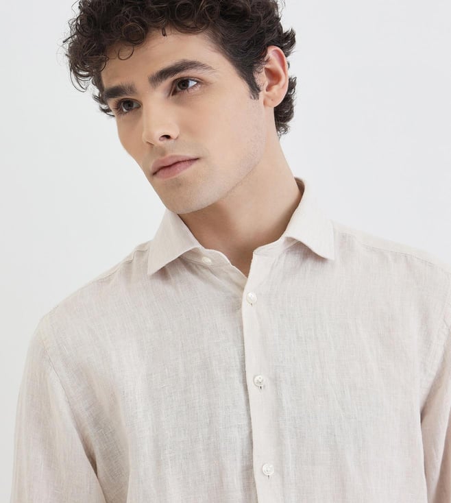 Elevate your wardrobe with this beige shirt, featuring a casual modern fit and solid pattern. Crafted from a premium linen blend, it offers comfort and style. The full sleeves and spread collar add sophistication, while the button closure ensures a classic look. Perfect for any occasion, this shirt is a versatile essential.