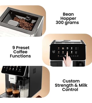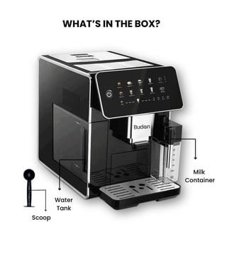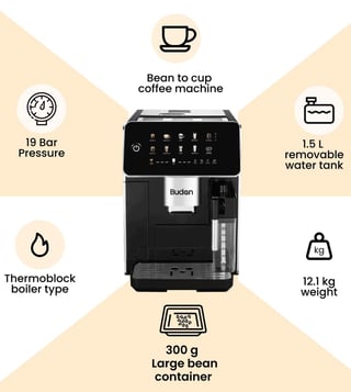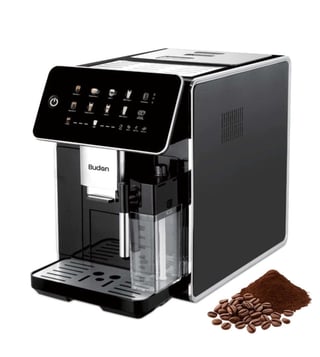 Enjoy caf¿-style coffee anytime with the Budan Brew500 Fully Automatic Coffee Machine. It features a built-in grinder, 15-bar Italian pump, and a dedicated milk frothing system for rich, creamy results. With 9 preset functions and dual cup brewing, you can easily make espresso, cappuccino, latte, and more. The detachable milk tank, large water reservoir, and smart cleaning reminders make upkeep effortless. Sleek, modern, and powerful, the Brew500 delivers professional performance and caf¿-quality coffee at the touch of a button.