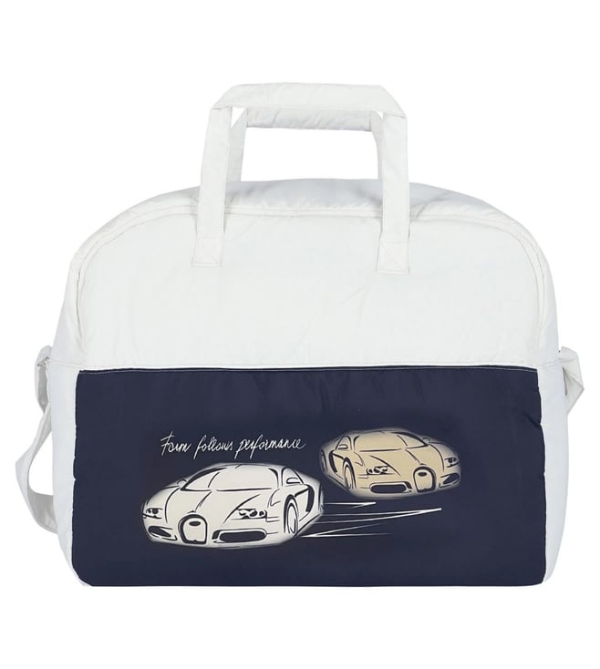This white and blue changing bag combines style with function, featuring multiple compartments and a roomy interior. Perfect for organizing baby essentials on the go. Crafted from premium materials, this compact bag features a striking printed design and a sleek silhouette for a modern look.