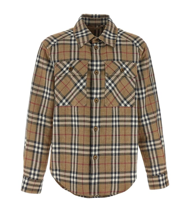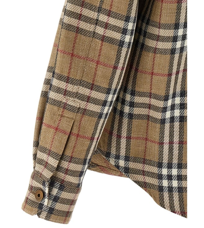 Elevate your style with the Burberry Beige Checked Oversized Fit shirt. Front metal button placket classic collar long sleeves buttoned cuffs patch pockets at chest with buttoned flap back yoke with box pleats curved hem burberry check motif doubleface cotton and linen design oversized fit. Products purchased from Darveys are supported exclusively by the warranty/exchange policies of Darveys and its partner boutiques. Brand owners and their channel partners are not responsible for exchange/warranty services for items purchased through Darveys.