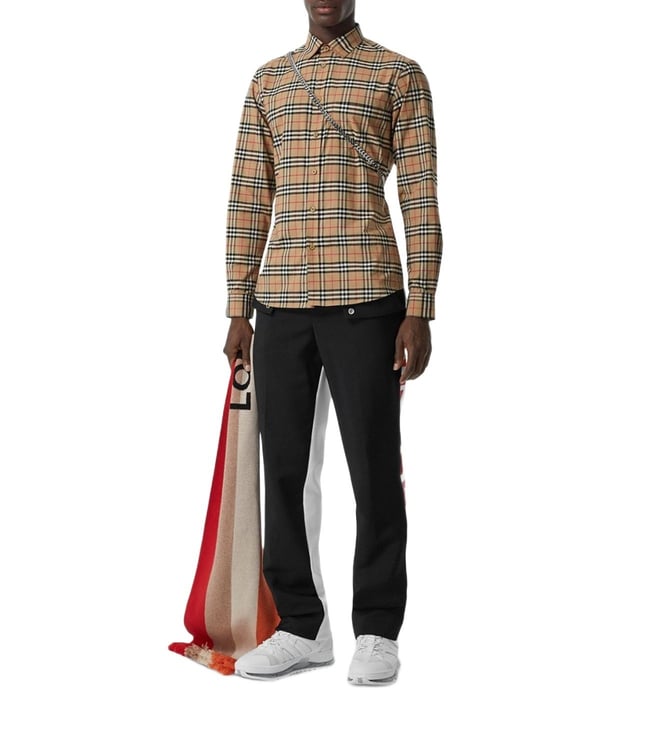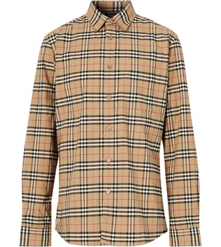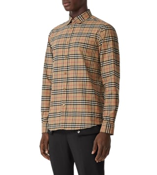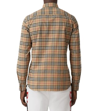 Elevate your style with the Burberry Beige Checked Regular Fit shirt. While the iconic check has been around for quite some time, burberry's always finds ways to make it feel fresh. Spun from stretch cotton, this small scale check shirt from burberry is just eternal Featuring a classic collar, a front button fastening, lon this piece fits true to size. recommend you get your regular size model is 1,84m / 6ft 1in wearing size m.