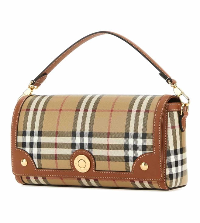 Expand the collection of your accessories in a trendy way with this bag from Burberry. Beige cotton/leathercheck patterngold-tone logo plaquegold-tone hardwarefront flap closuremagnetic fasteningmain compartmentsingle detachable top handledetachable shoulder strap. Products purchased from Darveys are supported exclusively by the warranty/exchange policies of Darveys and its partner boutiques. Brand owners and their channel partners are not responsible for exchange/warranty services for items purchased through Darveys.