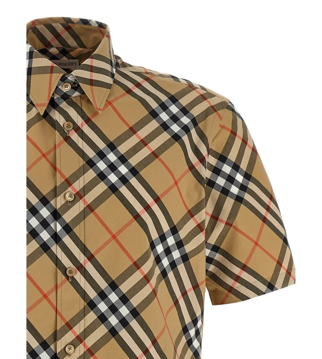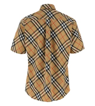 Elevate your style with the Burberry Beige Checked shirt. Check, collar, front button closure, short sleeve.