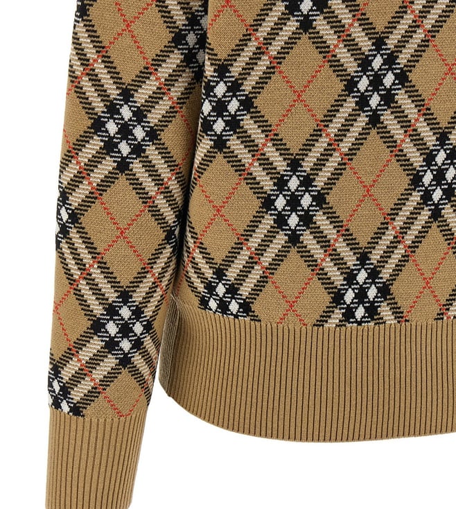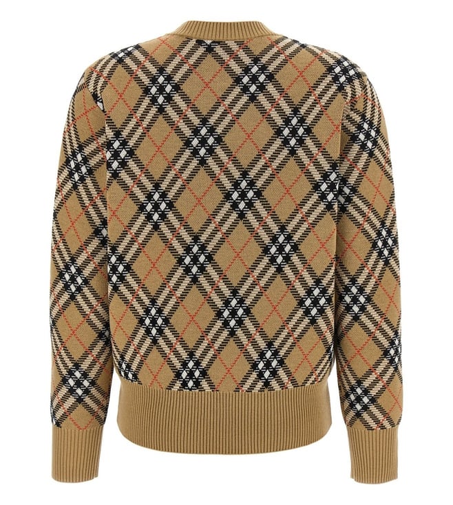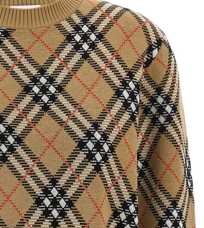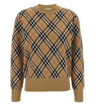 Wrap yourself in timeless elegance with the Burberry Beige Check Sweater, a masterpiece of classic design and modern comfort. Crafted from a luxurious blend of 95% wool and 5% polyester, this sweater offers warmth and durability. The iconic beige check pattern exudes sophistication, while the tailored fit flatters the feminine silhouette. Perfect for any occasion, this sweater is a testament to Burberry's legacy of style and quality, making it a must-have addition to any woman's wardrobe.