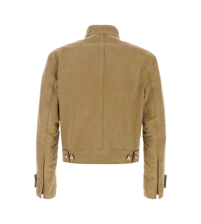 Elevate your style with the Burberry Khaki Embroidered Denim Jacket. Beige, button cuff closure, pockets, long sleeves, straight hem, front button closure and logo details. Products purchased from Darveys are supported exclusively by the warranty/exchange policies of Darveys and its partner boutiques. Brand owners and their channel partners are not responsible for exchange/warranty services for items purchased through Darveys.