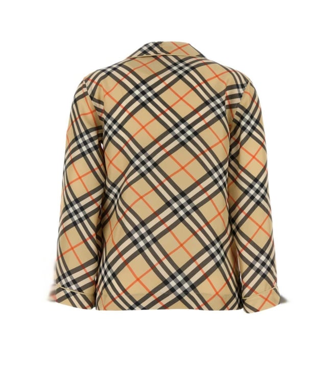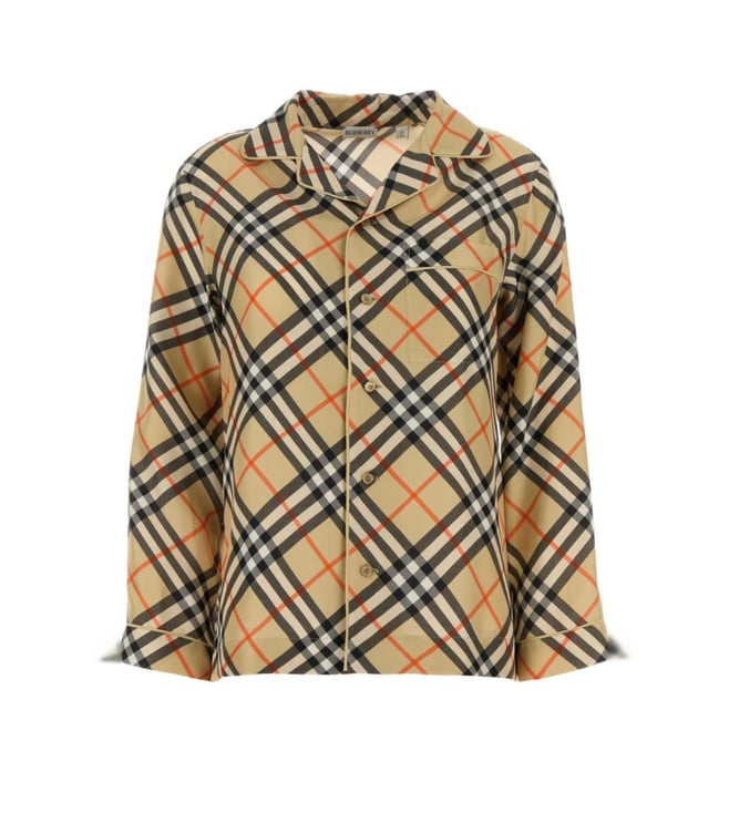 Elevate your wardrobe with this exquisite beige checked casual shirt, designed for the modern woman. Crafted from 100% silk, it offers a luxurious feel and a sophisticated drape. The long sleeves and lapel collar add a touch of elegance, while the intricate checked pattern provides a timeless appeal. Perfect for any occasion, this shirt features a seamless closure, ensuring a sleek silhouette. Whether paired with jeans or a skirt, it promises to be a versatile staple in your collection.
