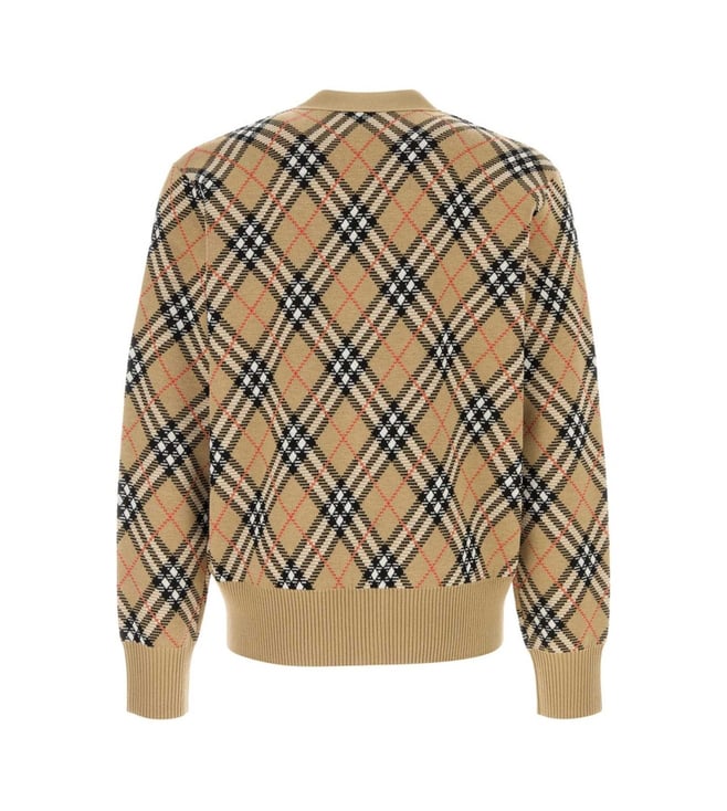 Elevate your style with the Burberry Beige Checked Cardigan. Burberry's wool cardigan is an essential piece with classic appeal, ideal for completing everyday looks with elegance. Crafted from soft wool, it features a vneck, a front button closure and ribbed trim at the hem and cuffs for a comfortable fit with attention to detail.