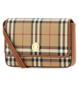 Beige leather grained texture signature burberry check pattern logo plaque foldover top adjustable detachable shoulder strap main compartment internal patch pocket debossed internal logo contrast cotton lining logo-engraved gold-tone hardware concealed magnetic fastening. Products purchased from Darveys are supported exclusively by the warranty/exchange policies of Darveys and its partner boutiques. Brand owners and their channel partners are not responsible for exchange/warranty services for items purchased through Darveys.