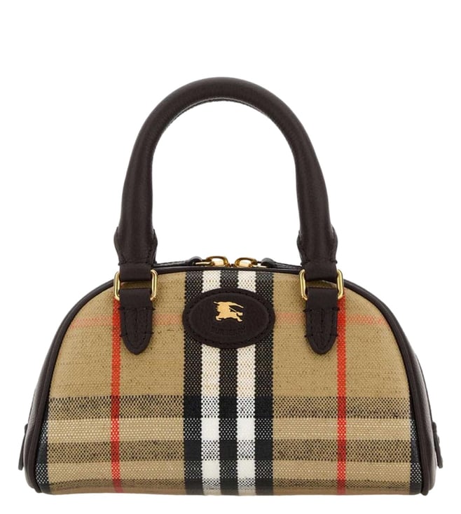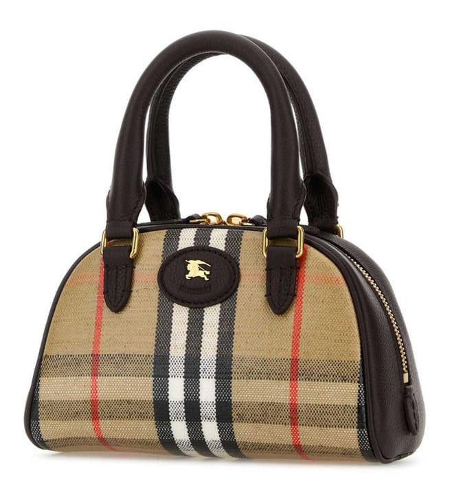 Beige Highlands Mini Duffle Bag, zip closure, 1 compartment, checks, front logo, dual carry handles with Detachable, adjustable leather strap. With its timeless design and practical features, this bag is a must-have accessory for the modern woman on-the-go. Products purchased from Darveys are supported exclusively by the warranty/exchange policies of Darveys and its partner boutiques. Brand owners and their channel partners are not responsible for exchange/warranty services for items purchased through Darveys.