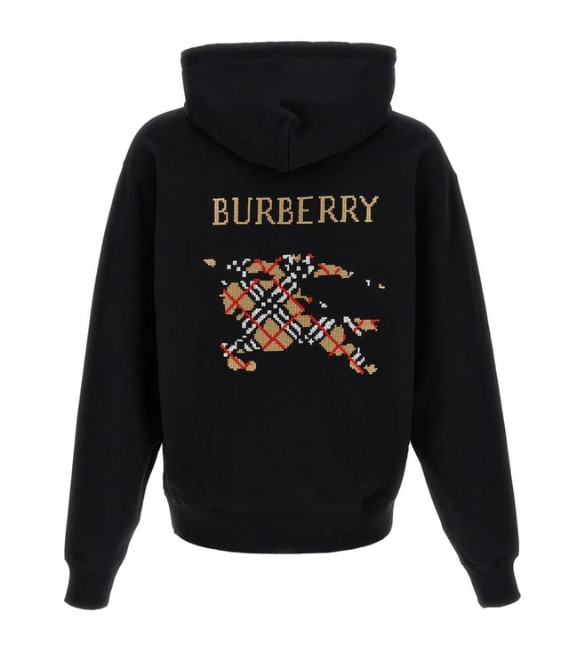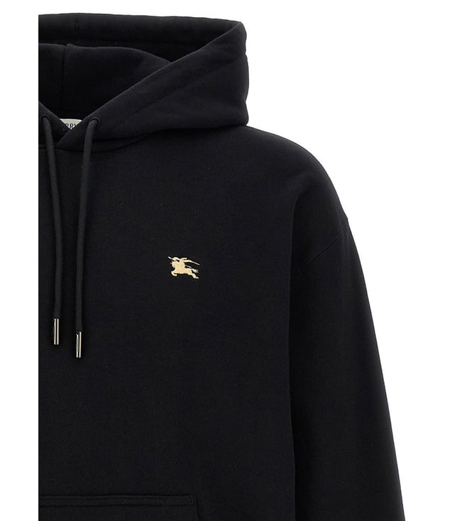 Elevate your style with the Burberry Black Hoodie. Drawstring hood front logo embroidery kangaroo pocket long cuffed sleeves ribbed cuffs and hem pullover.