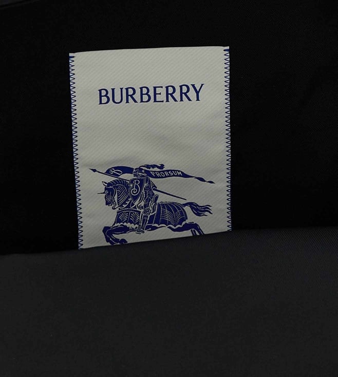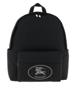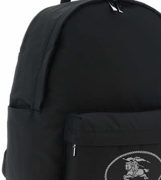 Black orkney nylon backpack, front pocket with equestrian knight design woven in fil coup with reflective yarn and zip, fixed handle, top zip closure, adjustable shoulder straps, mesh backrest with burberry check pattern. Products purchased from Darveys are supported exclusively by the warranty/exchange policies of Darveys and its partner boutiques. Brand owners and their channel partners are not responsible for exchange/warranty services for items purchased through Darveys.