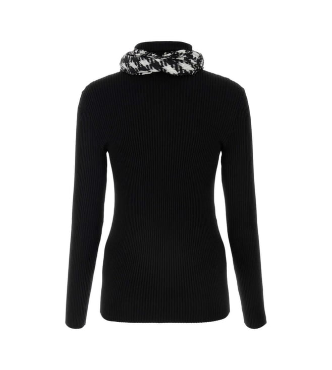 The Burberry Black Scarf Sweater is a sophisticated blend of elegance and modernity, featuring a striking color palette and intricate pattern that captures attention. Crafted from a luxurious blend of 91% viscose, 7% nylon, and 2% elastane, this sweater offers a soft, comfortable fit with a hint of stretch. Designed for the discerning woman, it boasts a seamless closure that enhances its sleek silhouette. Perfect for any occasion, this piece embodies timeless style and effortless grace.