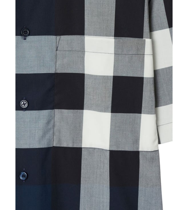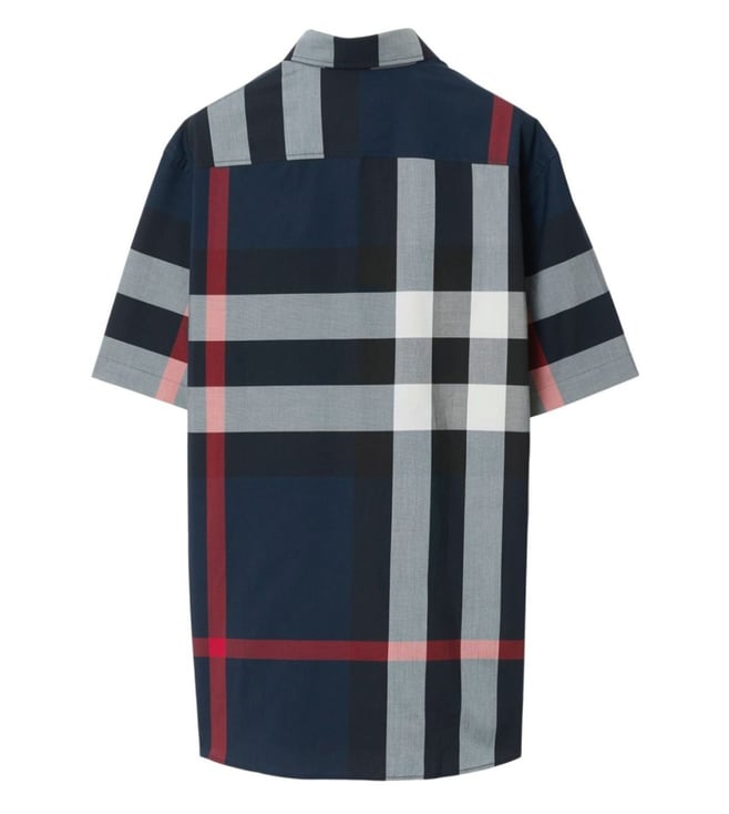 Elevate your style with the Burberry Navy Checked Regular Fit shirt. Cotton, check pattern, classic collar, front button fastening, short sleeves, chest patch pocket, and curved hem. This piece fits true to size. recommend you get your regular size model is 1,84m / 6ft 1in wearing size m.