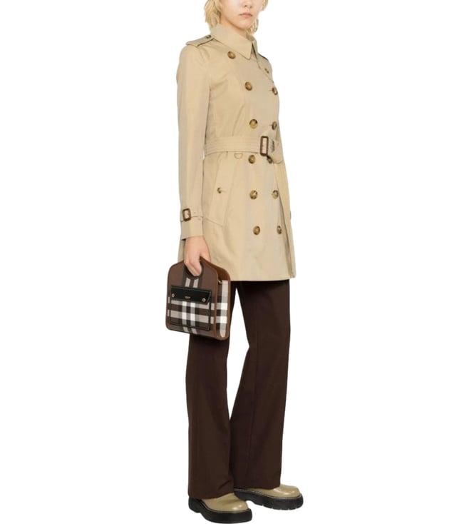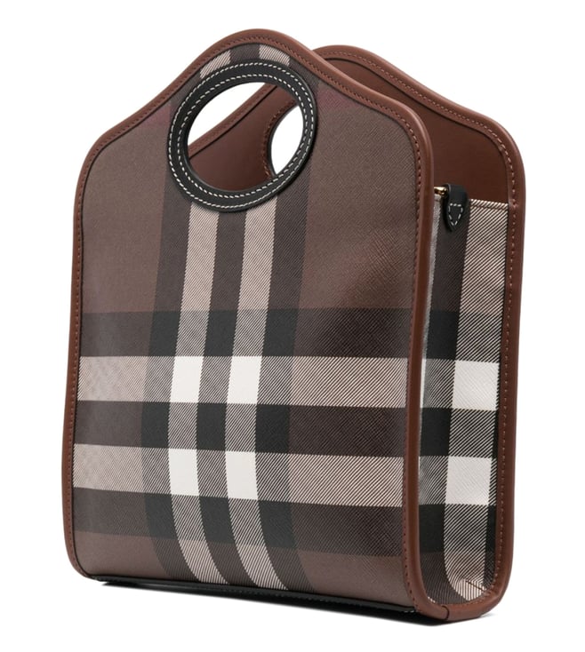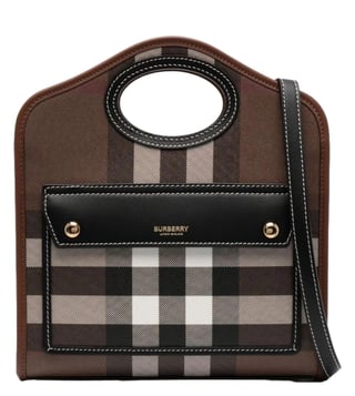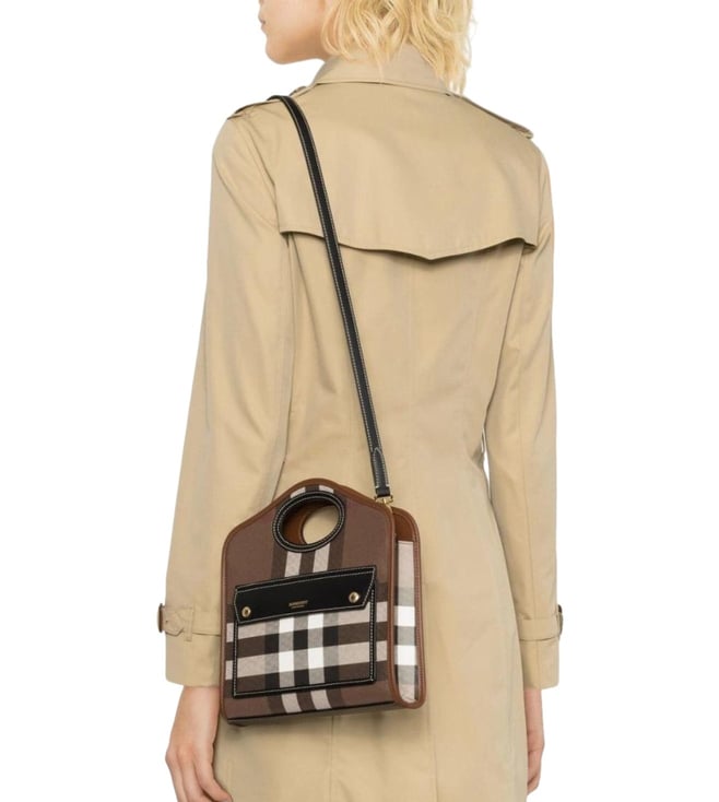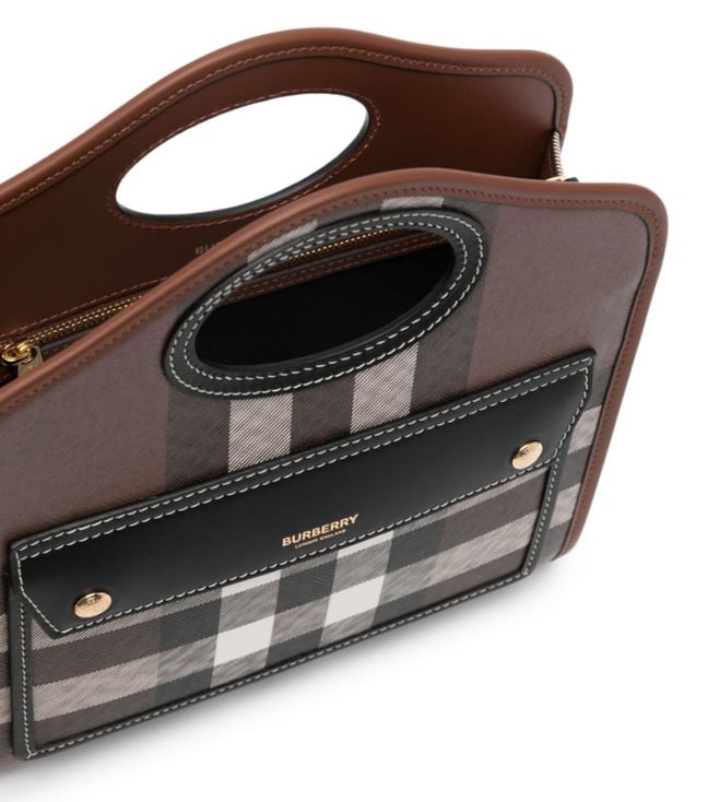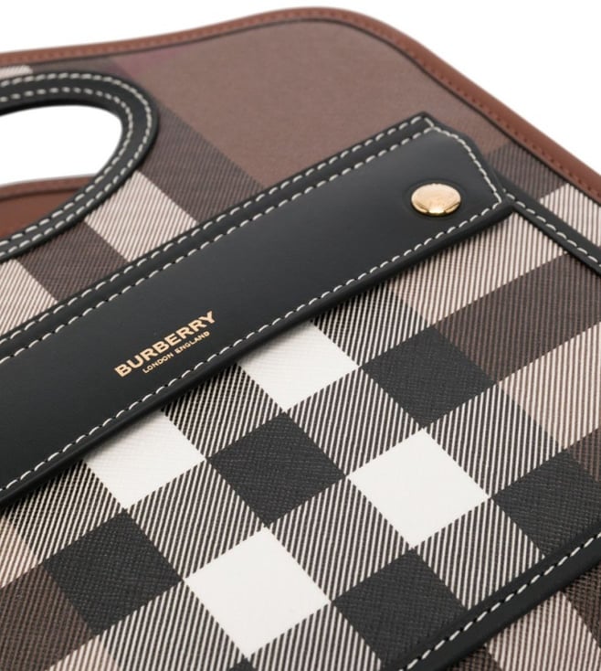 Pocket mini tote bag from burberry featuring brown, multicolour, canvas, leather trim, house check pattern, logo stamp to the front, front flap pocket, cut-out top handle, main compartment, internal zip-fastening pocket and detachable shoulder strap.