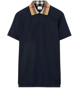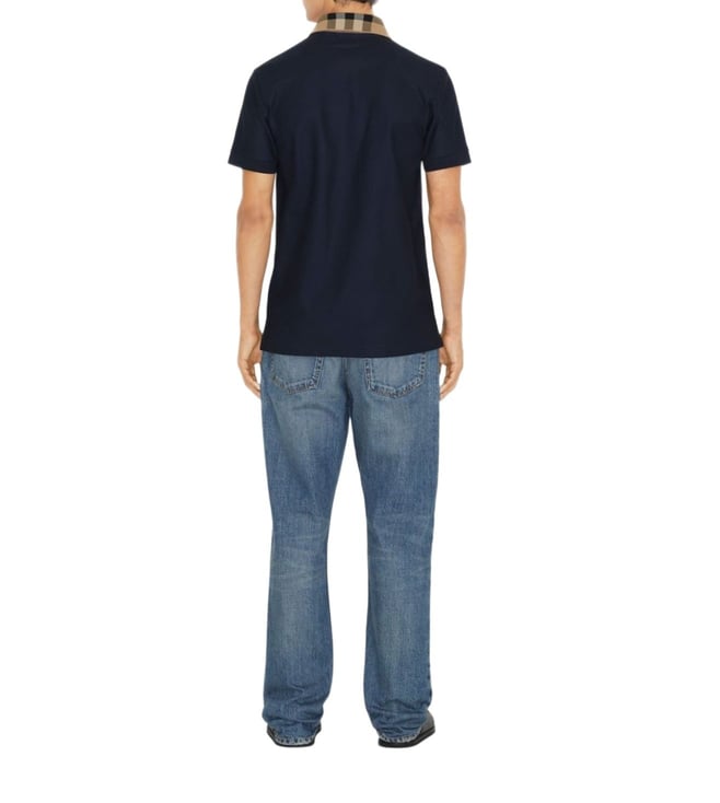 Elevate your style with the Burberry Navy Checked Regular Fit polo t-shirt. Checkedcollar cotton polo shirt from burberry featuring navy blue, cotton, jersey knit, vintage check pattern, contrasting collar, front button placket, short sleeves and straight hem. This piece fits true to size. recommend you get your regular size model is 1,84m / 6ft 1in wearing size m.