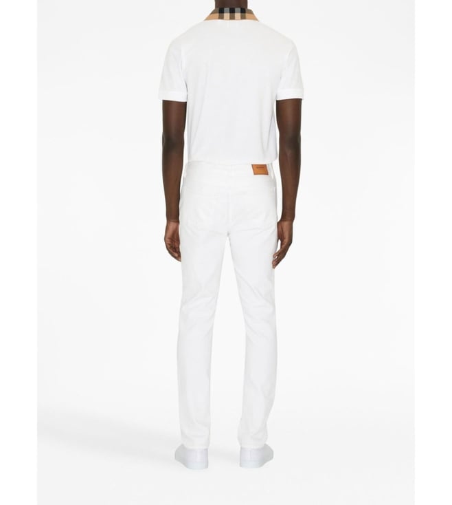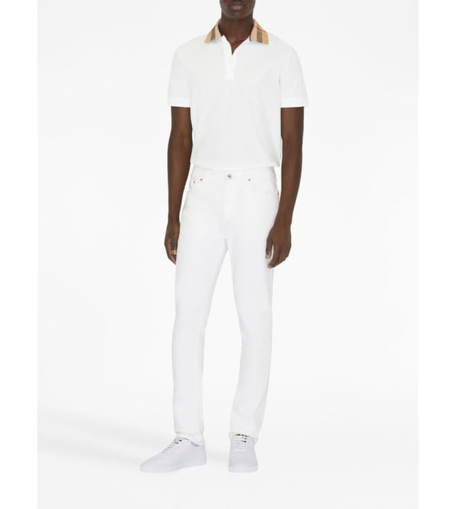 Elevate your style with the Burberry White Checked Regular Fit polo t-shirt. Vintage check printdetail polo shirt from burberry featuring white, cotton blend, vintage check pattern, classic collar, stretchdesign, short sleeves and straight hem. This piece fits true to size. recommend you get your regular size model is 1,84m / 6ft 1in wearing size m.