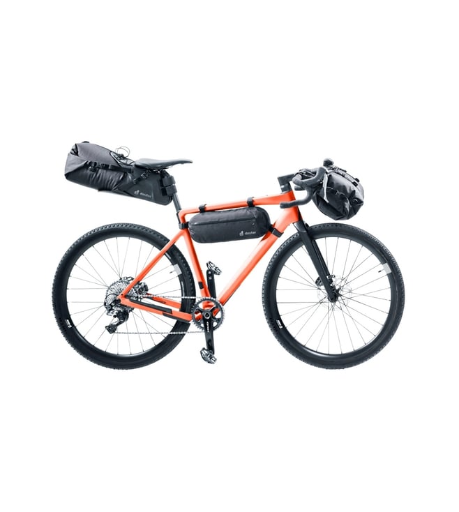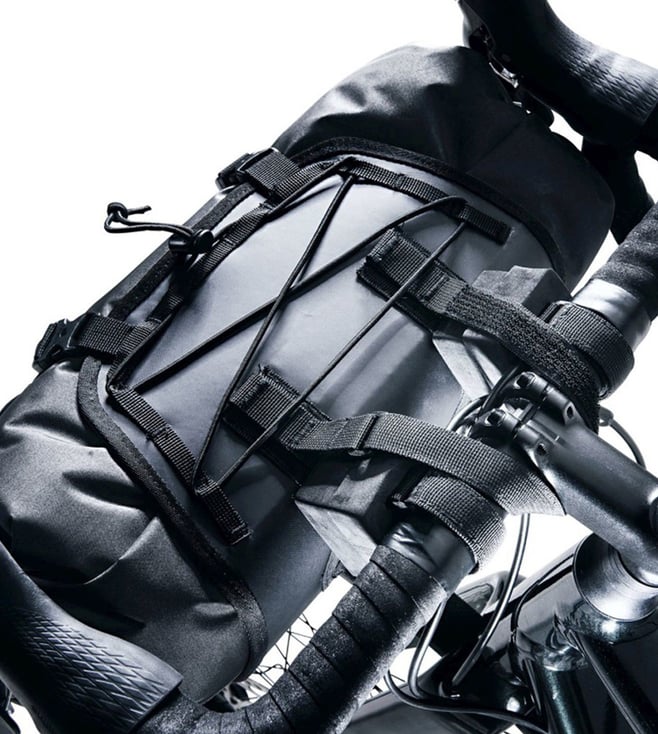 The two-piece construction of this handlebar pack for globetrotting bikepackers, is made up of a lightweight, waterproof dry bag with roll-top closure at both ends, and a harness made from durable materials with a bungee cord and gear loops on the top that makes loading and unloading quick and easy during short rest breaks, because the dry bag can be detached while the harness stays on the bike. The durable straps on these bike bags feature hook and loop fasteners for secure positioning, and the spacers make it possible to mount them on a variety of frame sizes and tube diameters.
