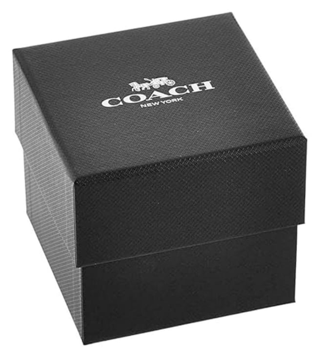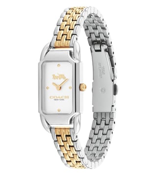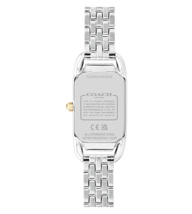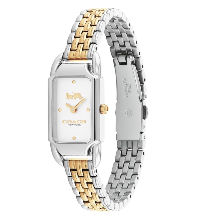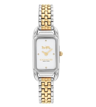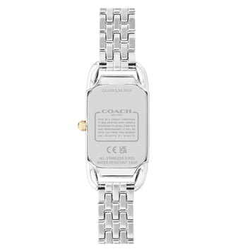 Look modish by donning this women watch from the cadie collection by Coach. The silver rectangular dial is secured by a mineral glass. It displays analog, and a crown for time adjustment. The stainless steel strap showcases a two tone hue that uplifts the look of the timepiece.