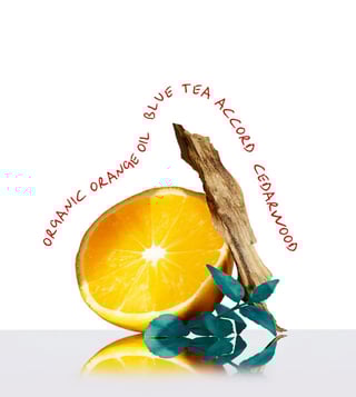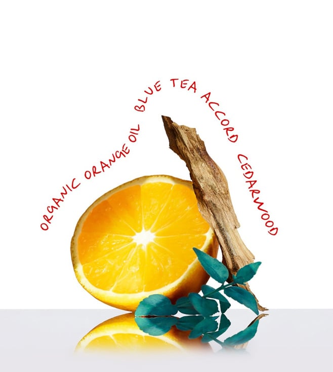 Organic orange oil layers over a heart of blue tea accord and a musky base of cedarwood, creating a complex, uplifting scent.
