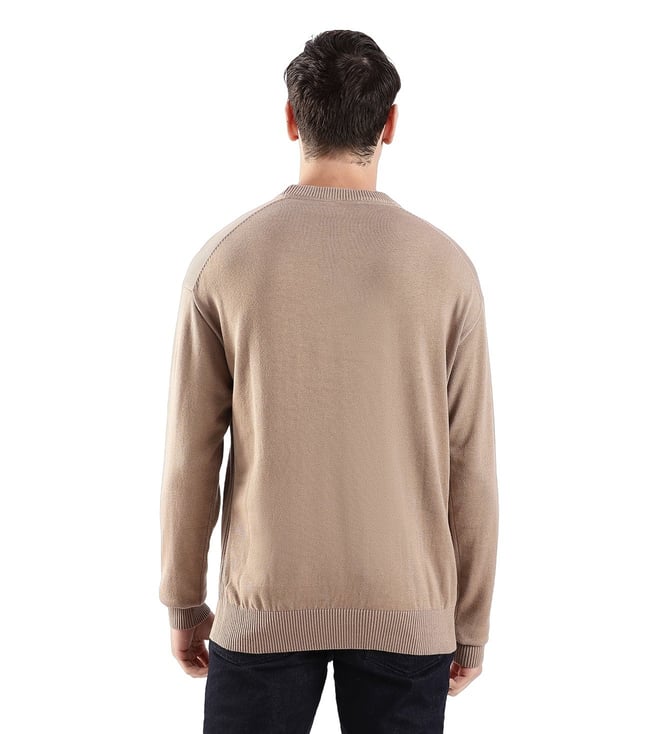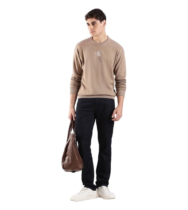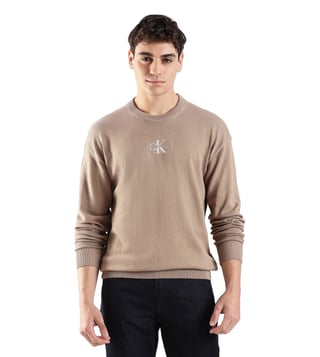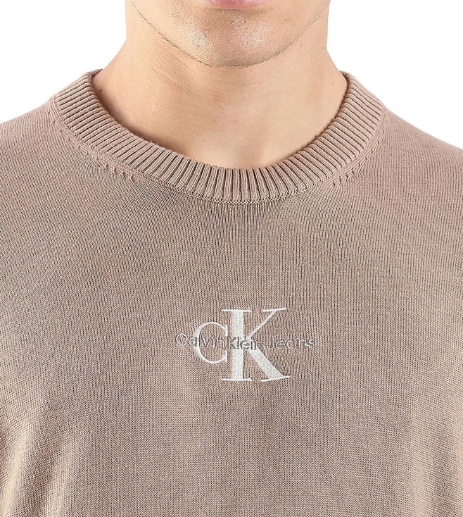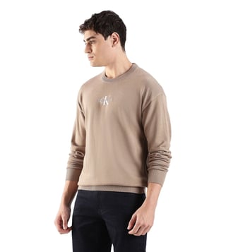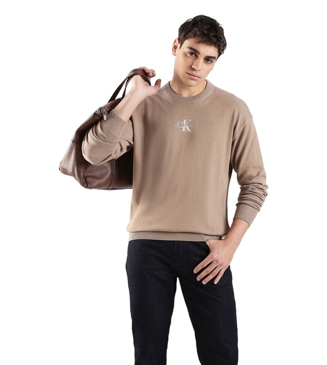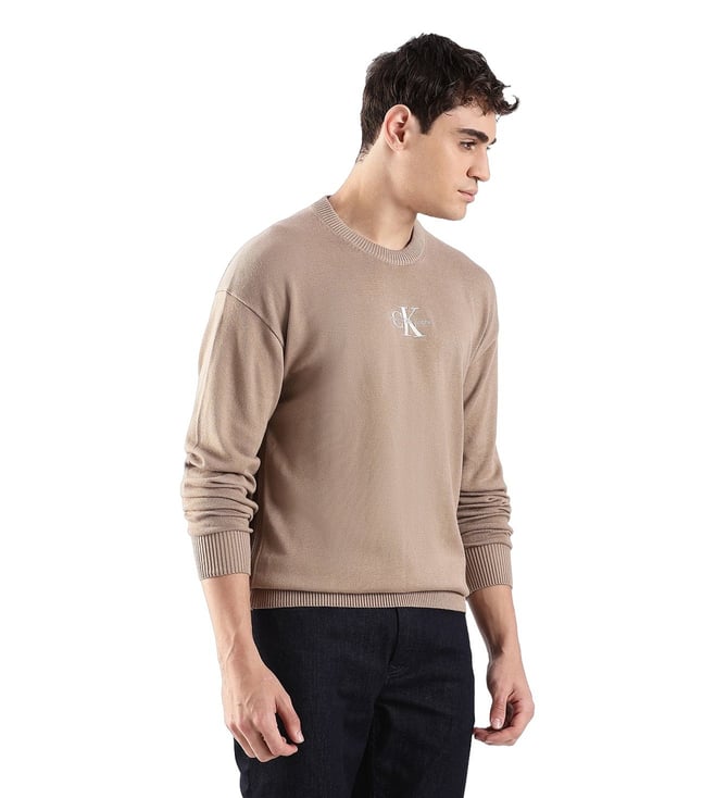 CALVIN KLEIN JEANS Beige Cotton Comfort Fit Logo Printed Sweater