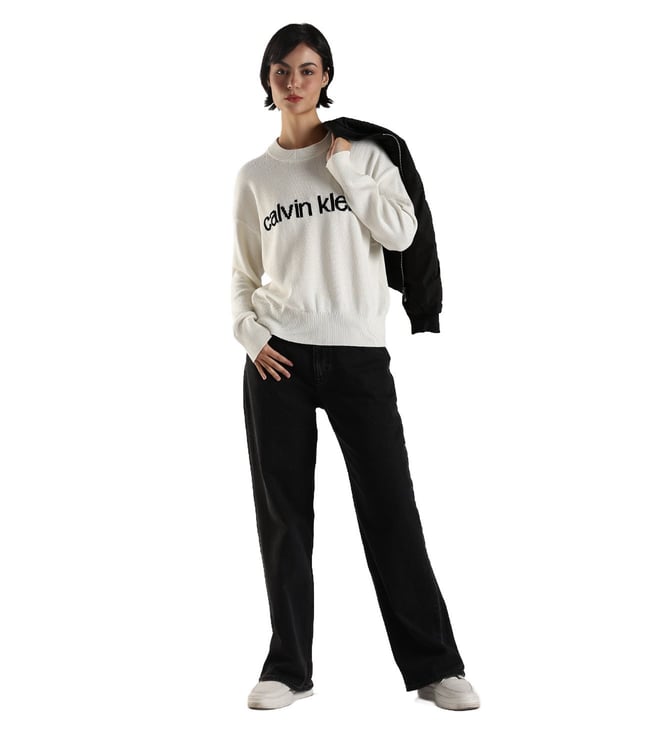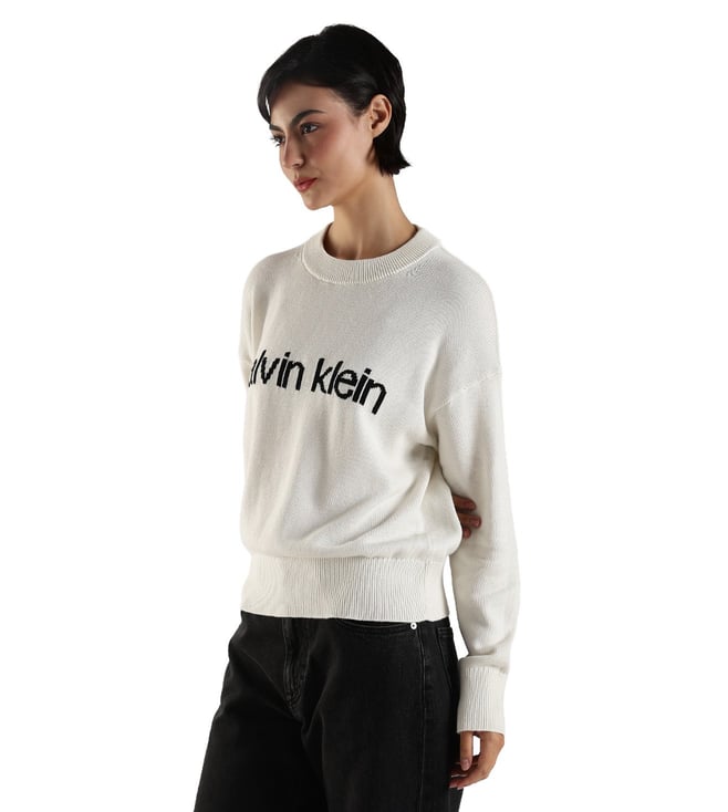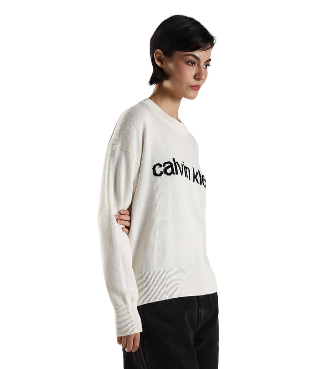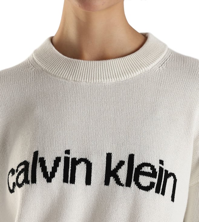 Elevate your casual wardrobe with the CALVIN KLEIN JEANS Off White Woven Design Regular Fit Sweater. Crafted with premium quality material, this sweater offers a comfortable and stylish option for everyday wear. The classic regular fit silhouette is complemented by the iconic Calvin Klein logo print, adding a touch of sophistication to your outfit. Perfect for layering or wearing on its own, this sweater is versatile and effortlessly cool. Stay cozy and on-trend with this must-have piece from Calvin Klein Jeans.
