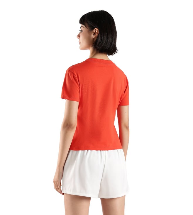 Make a vibrant statement with this red western-style T-shirt, designed to add a pop of color to your casual wardrobe. Crafted from soft, breathable cotton with a knitted construction, this women's tee combines comfort with style for your everyday adventures. The eye-catching logo pattern adds a touch of personality, making it stand out from your basic tees. Perfect for casual occasions and basic activities, this versatile piece effortlessly transitions from running errands to meeting friends for coffee.