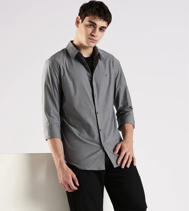 Grey Cotton Slim Fit Striped Shirt