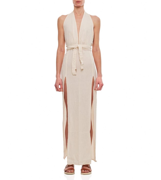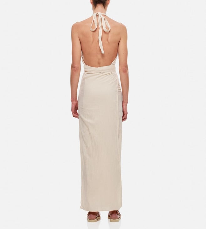 Embrace timeless elegance with this stunning white dress, crafted from 100% cotton for a breathable, luxurious feel. The solid pattern exudes simplicity and sophistication, while the sleeveless design and halter neck add a touch of modern allure. Perfect for sunlit days or moonlit nights, this dress offers a seamless blend of comfort and style. Its sleek closure ensures a flattering fit, making it an essential addition to any woman's wardrobe, ideal for both casual outings and special occasions.